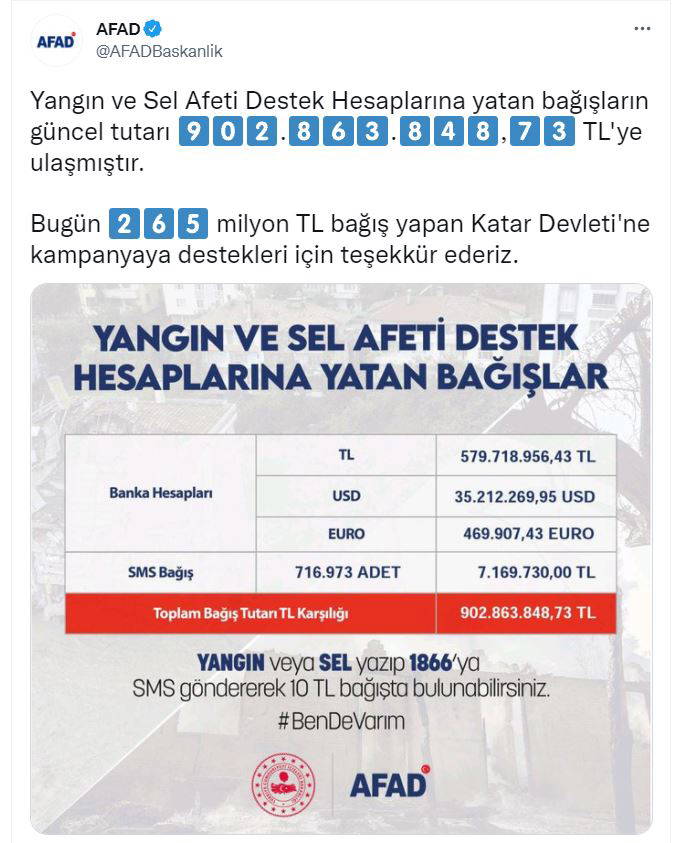 AFAD'ın Twitter hesabından yapılan açıklamada, "Yangın ve Sel Afeti Destek Hesaplarına yatan bağışların güncel tutarı 902 milyon 863 bin 848 TL'ye ulaşmıştır. Bugün 265 milyon TL bağış yapan Katar Devleti'ne kampanyaya destekleri için teşekkür ederiz" ifadeleri kullandıldı.