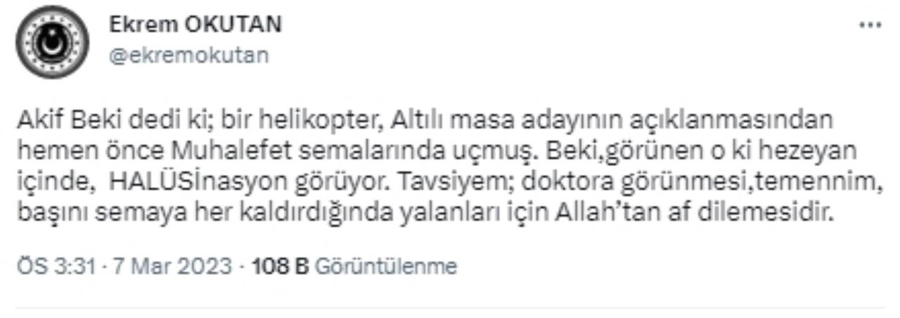 Okutan iddiaya köşesinde yer veren Beki'ye de "Görünen o ki hezeyan içinde, halüsinasyon görüyor. Tavsiyem; doktora görünmesi, temennim, başını semaya her kaldırdığında yalanları için Allah’tan af dilemesidir" diye seslendi.
