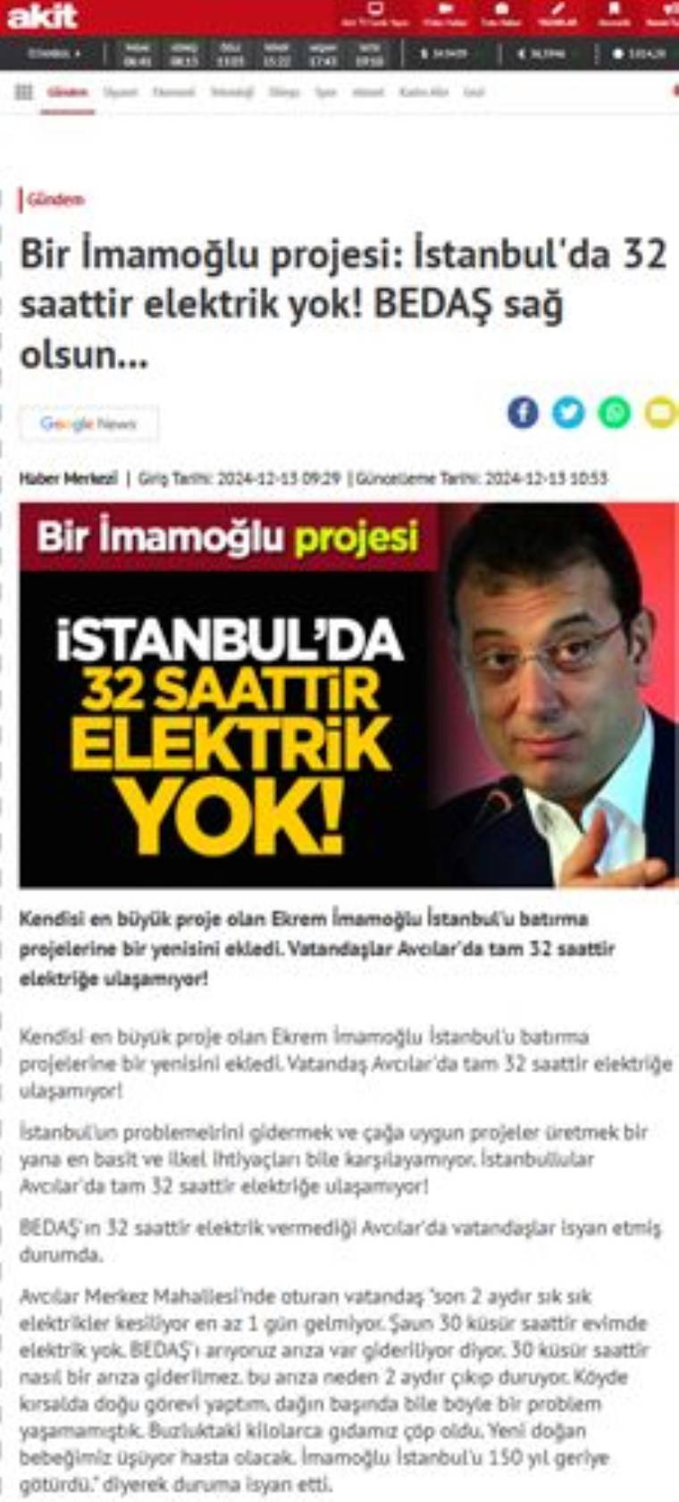 Haberde "Kendisi en büyük proje olan Ekrem İmamoğlu İstanbul'u batırma projelerine bir yenisini ekledi. Vatandaşlar Avcılar'da tam 32 saattir elektriğe ulaşamıyor!" denildi.