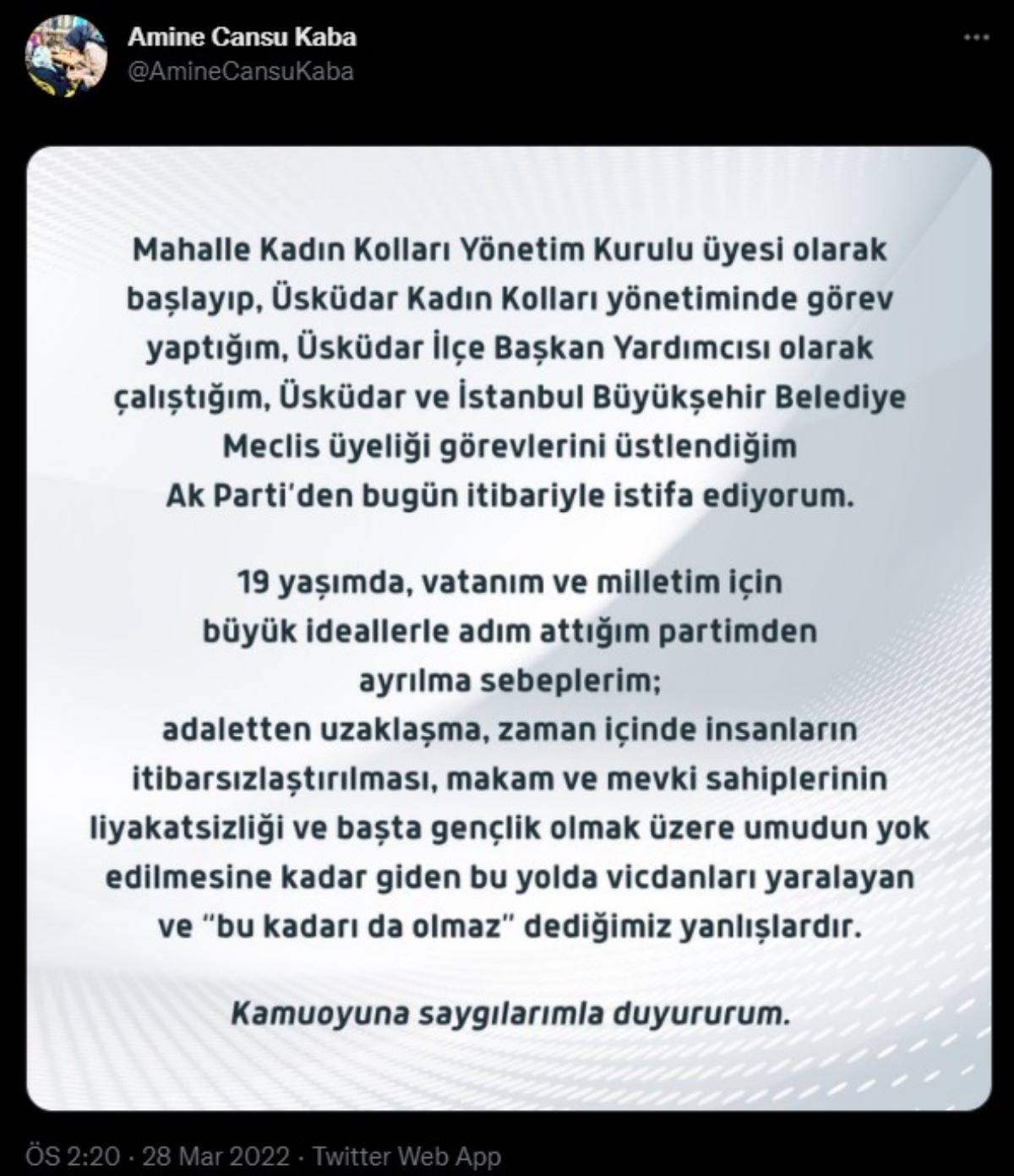 AKP Üsküdar Kadın Kolları yönetiminde görev yapan, Üsküdar İlçe Başkan Yardımcısı olarak çalışan ve Üsküdar ile İBB Meclis üyesi Amine Cansu Kaba, partisinden istifa etti.