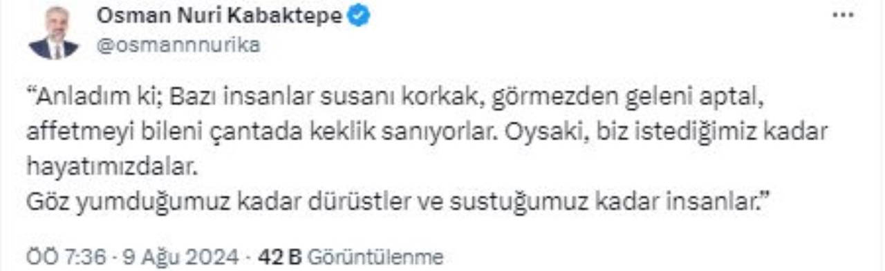AKP İstanbul İl Başkanı Osman Nuri Kabaktepe, X hesabından “Anladım ki; Bazı insanlar susanı korkak, görmezden geleni aptal, affetmeyi bileni çantada keklik sanıyorlar. Oysaki, biz istediğimiz kadar hayatımızdalar. Göz yumduğumuz kadar dürüstler ve sustuğumuz kadar insanlar” paylaşımı yaptı.