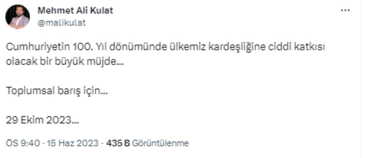 Kulat, "Cumhuriyetin 100. Yıl dönümünde ülkemiz kardeşliğine ciddi katkısı olacak bir büyük müjde... Toplumsal barış için... 29 Ekim 2023..." demişti.