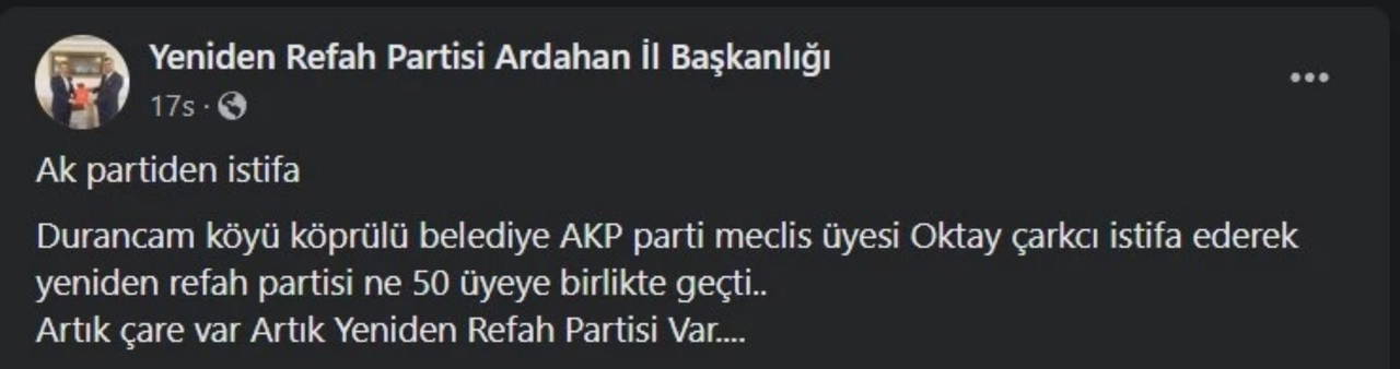 Ardahan’ın Köprülü Beldesi’nde AKP’li Belediye Meclis Üyesi Orhan Çarkçı, beraberindeki 50 partili ile istifa etti. İstifa eden AKP’liler Yeniden Refah Partisi’ne katıldı. Yeniden Refah Partisi Ardahan İl Başkanlığı, istifa ve katılmaları sosyal medyadan duyurdu.