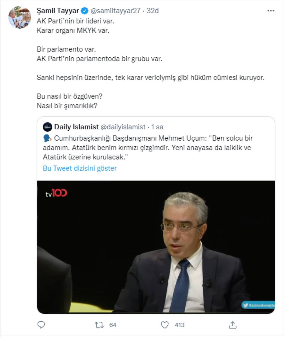 Tayyar, "AK Parti’nin bir lideri var. Karar organı MKYK var. Bir parlamento var. AK Parti’nin parlamentoda bir grubu var. Sanki hepsinin üzerinde, tek karar vericiymiş gibi hüküm cümlesi kuruyor. Bu nasıl bir özgüven? Nasıl bir şımarıklık?" ifadelerine yer verdi.