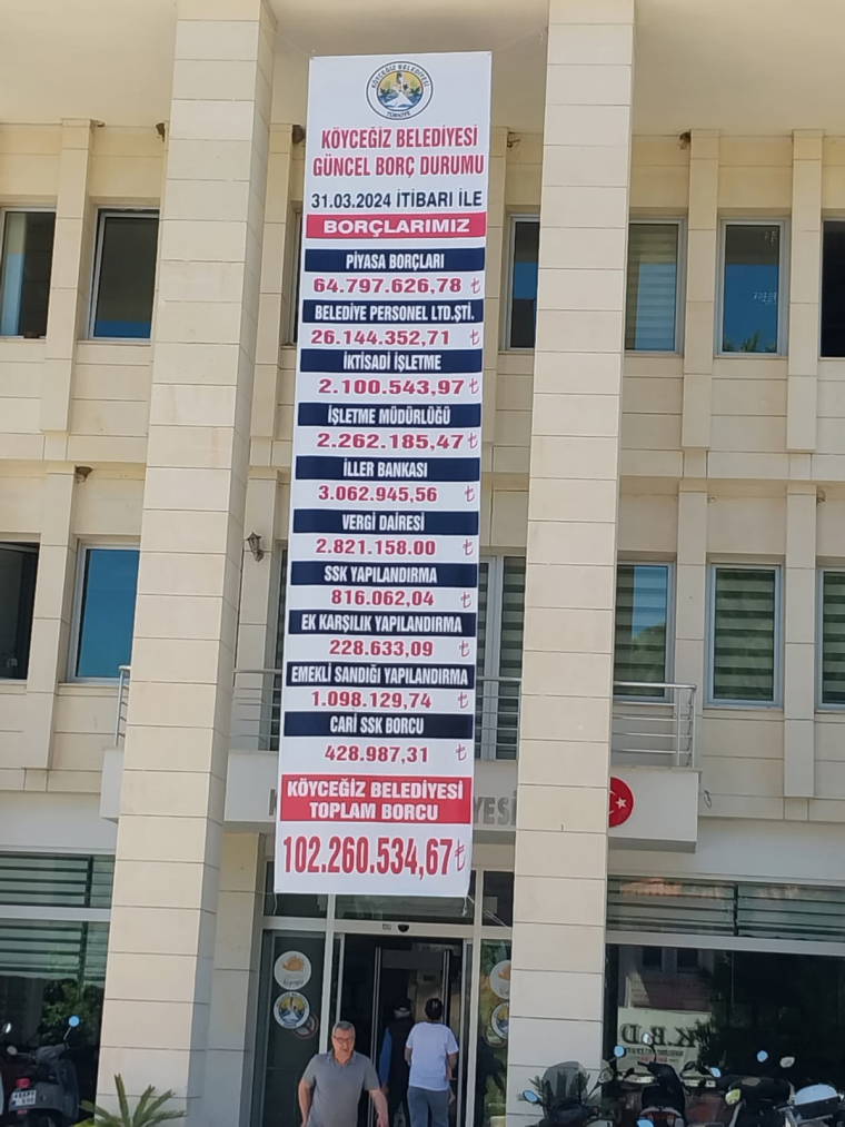 Asılan afişe göre 31 Mart 2024 tarihi itibarıyla Köyceğiz Belediyesi’nin toplam borcu 102.260.534.67 TL olduğu kaydedildi.