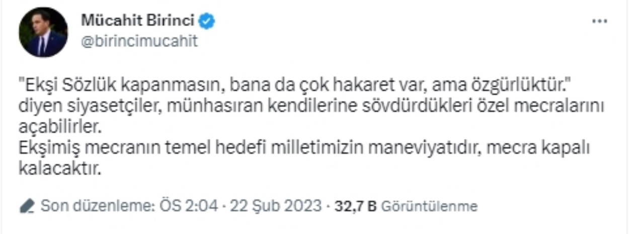 "Ekşi Sözlük kapanmasın, bana da çok hakaret var, ama özgürlüktür" diyen siyasetçiler, münhasıran kendilerine sövdürdükleri özel mecralarını açabilirler. Ekşimiş mecranın temel hedefi milletimizin maneviyatıdır, mecra kapalı kalacaktır."