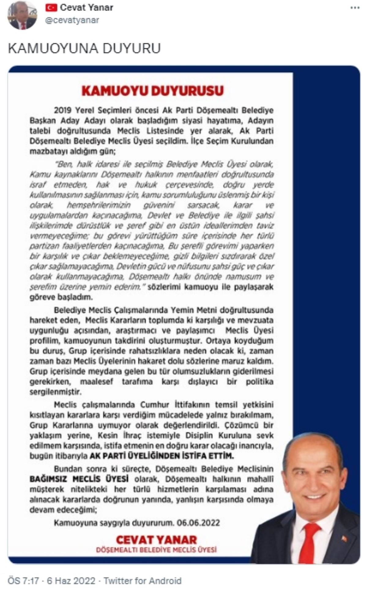 Antalya'nın Döşemealtı ilçesinde, İlçe Belediye Meclis Üyesi Cevat Yanar, AKP’den istifa etti. Yanar, bağımsız meclis üyesi olarak yoluna devam edeceğini açıkladı.
