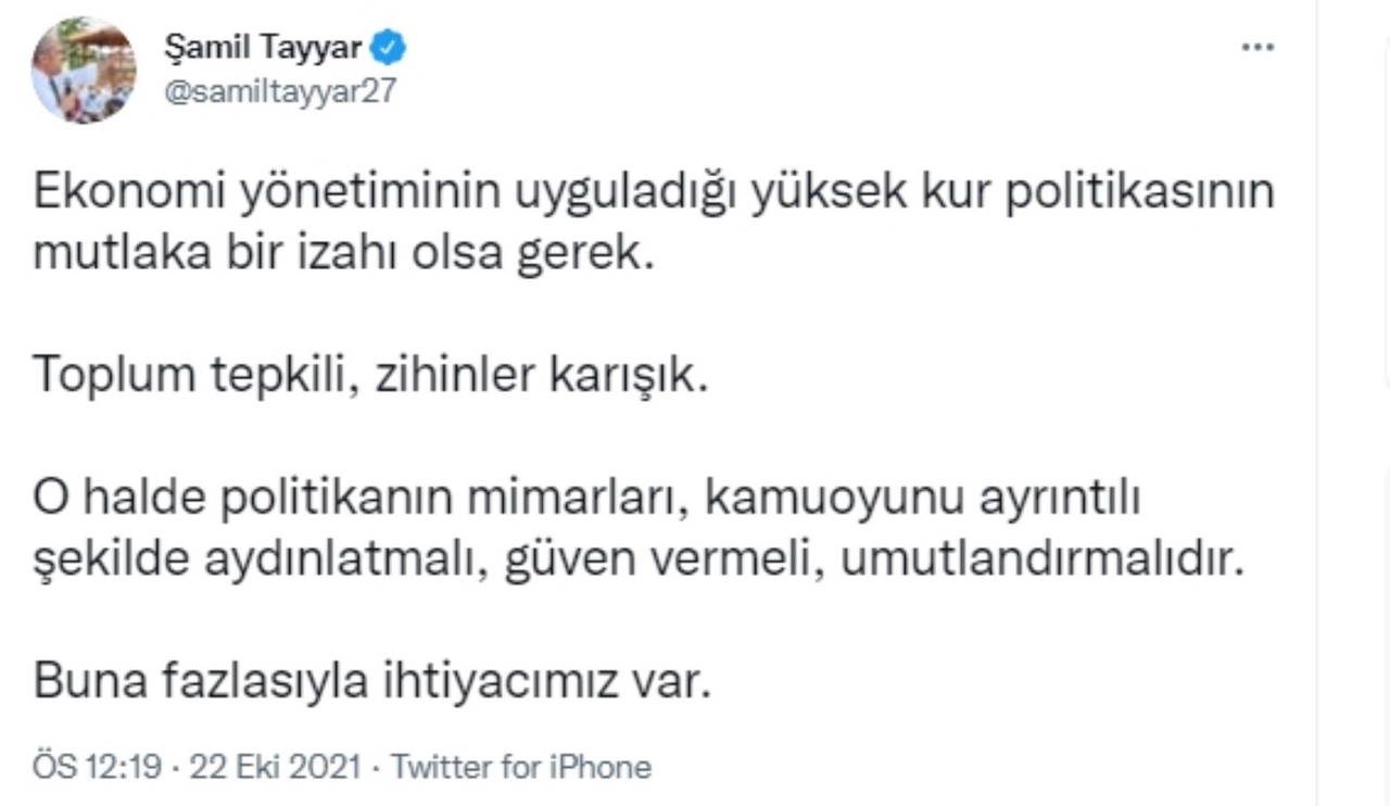 AKP MKYK Üyesi Şamil Tayyar, Twitter üzerinden yaptığı paylaşımda, Merkez Bankası'nın sözkonusu kararı sonrası döviz kurunun tırmanışa geçmesine işaret ederek "Ekonomi yönetiminin uyguladığı yüksek kur politikasının mutlaka bir izahı olsa gerek" dedi.