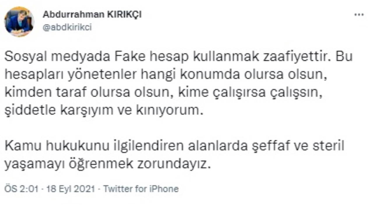 Başkan Kırıkçı paylaşımında, “Sosyal medyada Fake hesap kullanmak zaafiyettir. Bu hesapları yönetenler hangi konumda olursa olsun, kimden taraf olursa olsun, kime çalışırsa çalışsın, şiddetle karşıyım ve kınıyorum. Kamu hukukunu ilgilendiren alanlarda şeffaf ve steril yaşamayı öğrenmek zorundayız” ifadelerini kullandı.