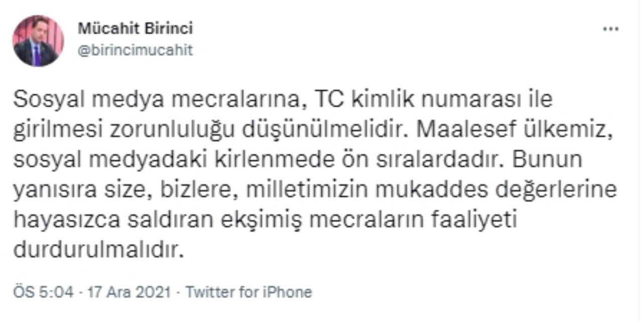 AKP MKYK Üyesi Mücahit Birinci, sosyal medya ağlarına Türkiye Cumhuriyeti kimlik numarasıyla girme zorunluluğu getirilmesini istedi.