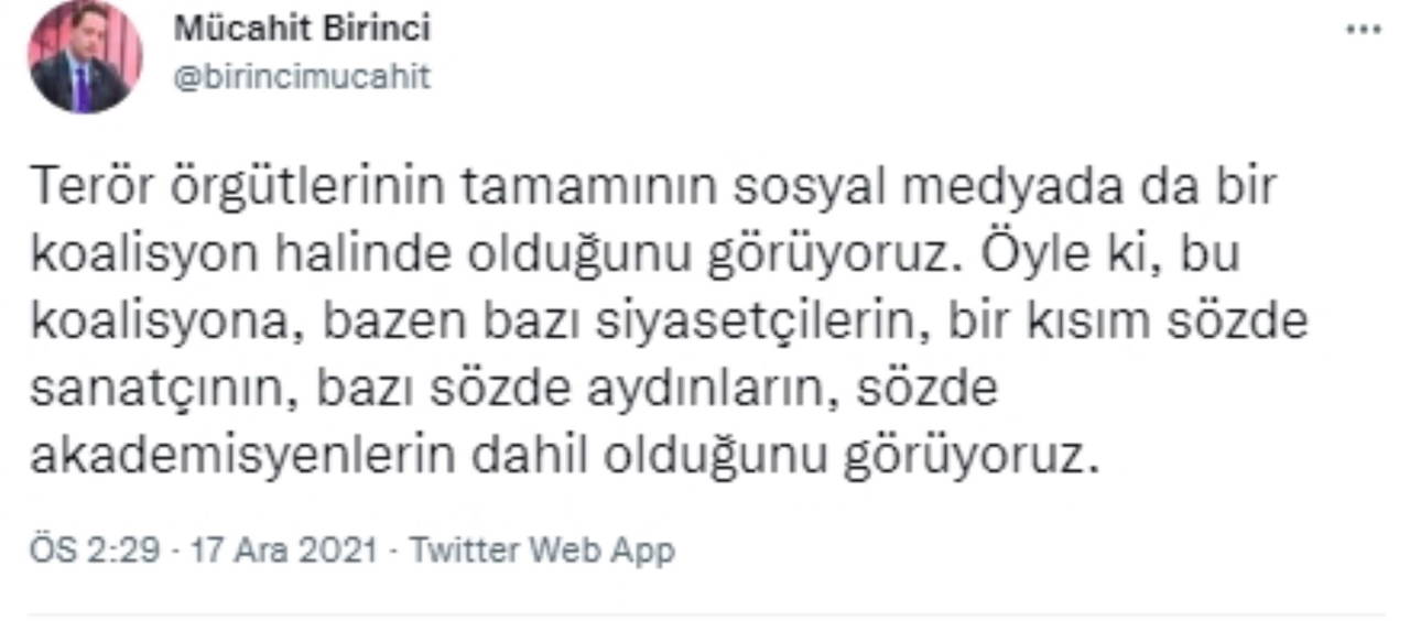 Birinci, Twitter üzerinden siyasiler, akademisyenler ve sanatçıların da aralarında olduğu sosyal medya kullanıcılarını ve Ekşi Sözlük gibi platformları hedef aldığı paylaşımlarında şu ifadeleri kullandı: