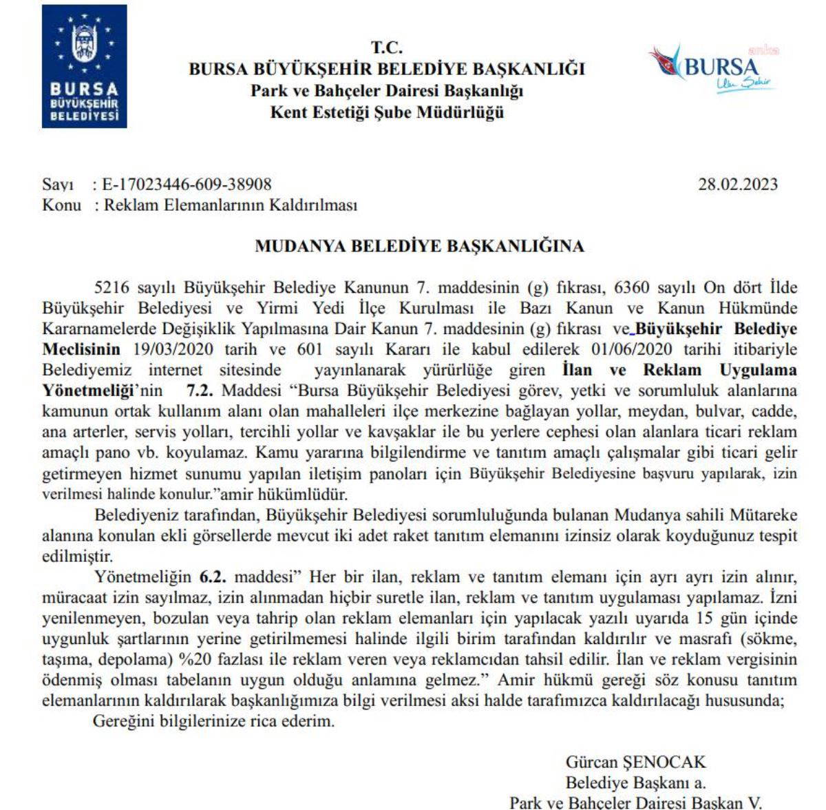 İddiaya göre, dün Büyükşehir Belediyesi tarafından Mudanya Belediye Başkanlığı’na “Reklam Elemanlarının Kaldırılması” konulu bir yazı gönderdi.
