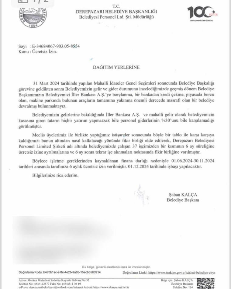 "31 Mart 2024 tarihinde yapılan Mahalli İdareler Genel Seçimleri sonucunda Belediye Başkalığı görevine geldikten sonra Belediyemizin gelir ve gider durumunu incelediğimizde geçmiş dönem Belediye Başkanımızın Belediyemizi İller Bankası A.Ş.’ye borçlanma, bir bankadan kredi çekme, piyasada borcu olan, makine parkında bulunan araçların tamamına yakınına önemli derecede masrafı olan bir belediye devralmış bulunmaktayız. Belediyemizin gelirlerine bakıldığında İller Bankası A.Ş. ve mahalli gelir olarak belediyemizin kasasına giren tutarın hiçbir yatırım yapmazsak bile personel giderlerinin yüzde 30’unu bile karşılamadığı görülmüştür. Meclis üyelerimiz ile birlikte yaptığımız istişareler sonucunda böyle bir tablo ile karşı karşıya kaldığımızı bunun altından nasıl kalkılacağı yönünde fikir birliği elde edilerek, Derepazarı Belediyesi Personel Limited Şirketi adı altında belediyemizde çalışan 37 işçimizden bir kısmının 6 ay süreliğine ücretsiz izine ayrılmalarına ve 6 ay sonra tekrar işe alınmaları noktasında fikir birliğine varılmıştır. Böylece işletme gereklerinden kaynaklanan finans darlığı nedeniyle 01.06.2024- 30.11.2024 tarihleri arasında tarafınıza 6 aylık ücretsiz izin verilmiştir. 01.12.2024 tarihinde işbaşı yapılacaktır."