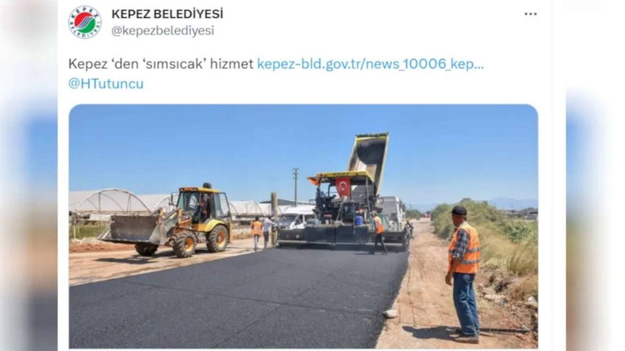 AKP'li belediye, işçilerin kavurucu havada 180 dereceyi bulan sıcaklıktaki asfaltı yola sermesini "Kepez‘den ‘sımsıcak’ hizmet" başlığıyla paylaştı.