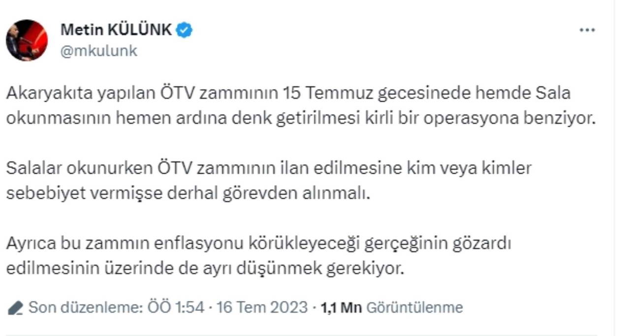 "Akaryakıta yapılan ÖTV zammının 15 Temmuz gecesine de hem de sela okunmasının hemen ardına denk getirilmesi kirli bir operasyona benziyor.