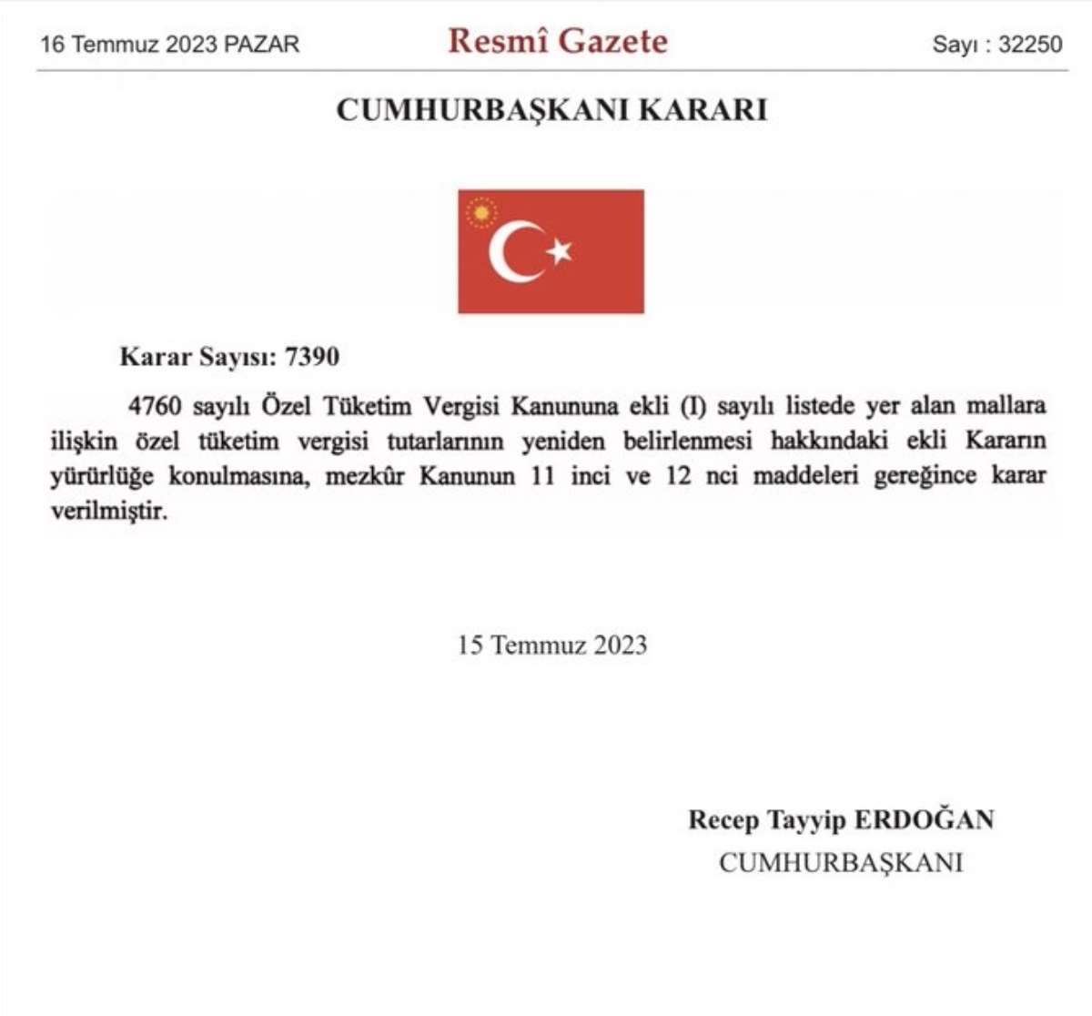 İşte ÖTV zammına ilişkin 16 Temmuz'un ilk saatlerinde Resmi Gazete'de, AKP'li Cumhurbaşkanı Recep Tayyip Erdoğan imzasıyla alınan yayımlanan karar: