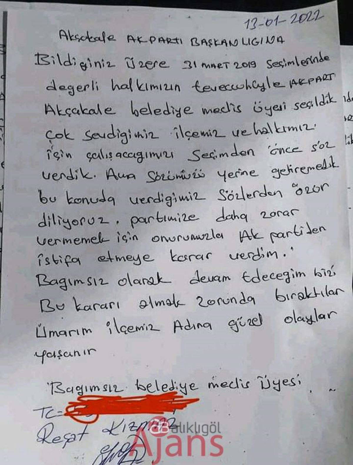 AKP'den istifa eden bir diğer belediye meclisi üyesi Reşat Kızmaz'ın istifa dilekçesinde ise “Bildiğiniz üzere 31 Mart 2019 seçimlerinde değerli halkımızın teveccühüyle AK Parti Akçakale belediye meclis üyesi seçildik. Çok sevdiğimiz ilçemiz ve halkımız için çalışacağımızı seçimden önce söz verdik ama sözümüzü yerine getiremedik. Bu konuda verdiğimiz sözlerden özür diliyoruz. Partimize daha zarar vermemek için onurumuzla AK Parti’den istifa etmeye karar verdim. Bağımsız olarak devam edeceğim. Bizi bu kararı almak zorunda bıraktılar. Umarım ilçemiz adına güzel olaylar yaşanır" ifadeleri yer aldı.