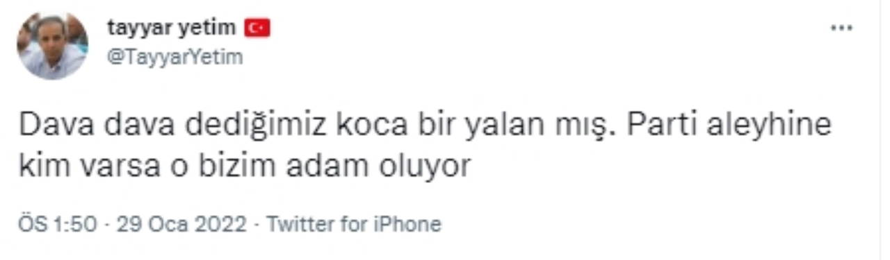 Tweet'i üzerine Cumhuriyet.com.tr olarak ulaştığımız Tayyar Yetim, yaptığı paylaşımının partisiyle bir uzlaşmazlık olarak anlaşılmaması gerektiği söyledi. Partisinde bazı isimlerin hakkı olmadığı halde bazı görevlere getirilmesine tepkili olduğunu söyleyen Yetim, buna örnek olarak da 'yeşil alan' gaspı iddialarıyla bilinen Şanlıurfa Kent Konseyi Başkanı Tayyar Yetim'in yapılan seçimde yeniden aynı göreve getirilmesini gösterdi.
