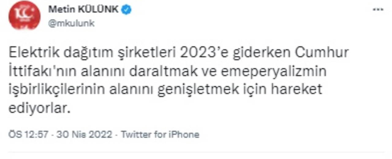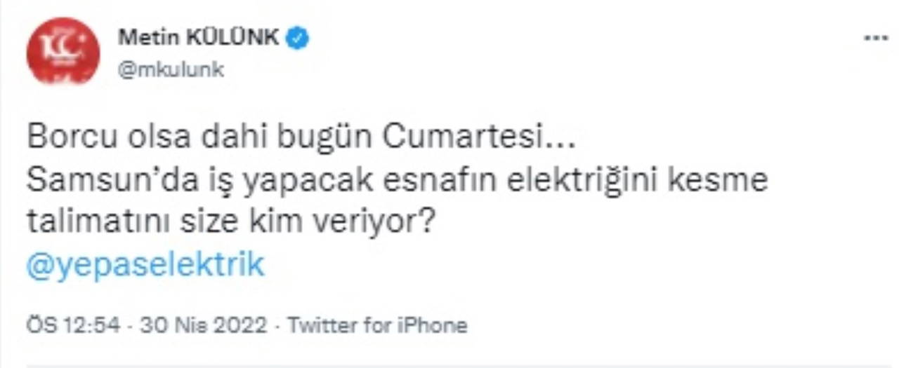 AKP'li Metin Külünk, Twitter hesabı üzerinden etiketlediği firmaya "Borcu olsa dahi bugün Cumartesi... Samsun’da iş yapacak esnafın elektriğini kesme talimatını size kim veriyor?" diye seslendi.