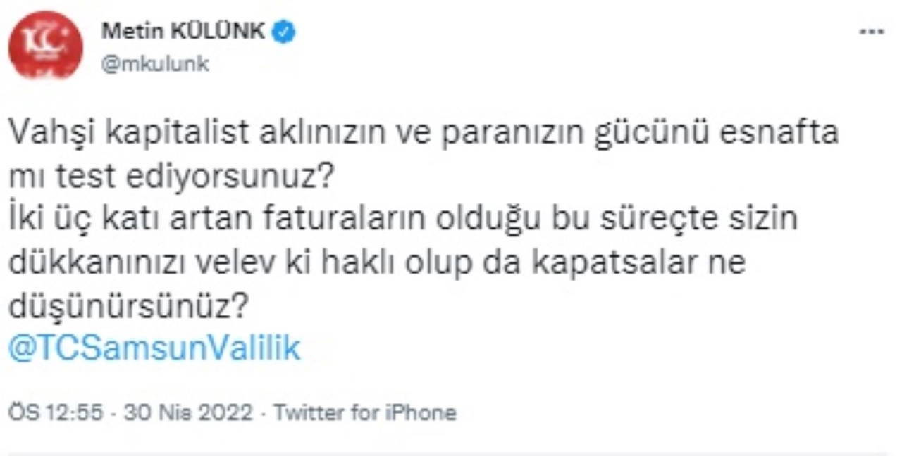 Daha sonra da Samsun Valiliği'nin hesabını etiketleyen Metin Külünk "Vahşi kapitalist aklınızın ve paranızın gücünü esnafta mı test ediyorsunuz? İki üç katı artan faturaların olduğu bu süreçte sizin dükkanınızı velev ki haklı olup da kapatsalar ne düşünürsünüz?" diye tepki gösterdi.