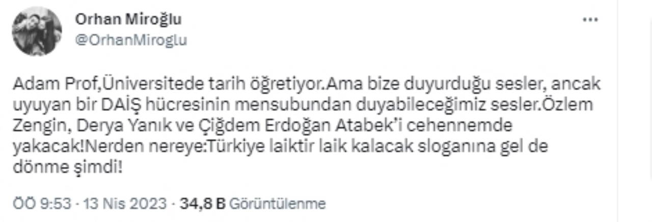 “Adam Prof. Üniversitede tarih öğretiyor. Ama bize duyurduğu sesler, ancak uyuyan bir DAİŞ hücresinin mensubundan duyabileceğimiz sesler. Özlem Zengin, Derya Yanık ve Çiğdem Erdoğan Atabek’i cehennemde yakacak! Nerden nereye: Türkiye laiktir laik kalacak sloganına gel de dönme şimdi!”