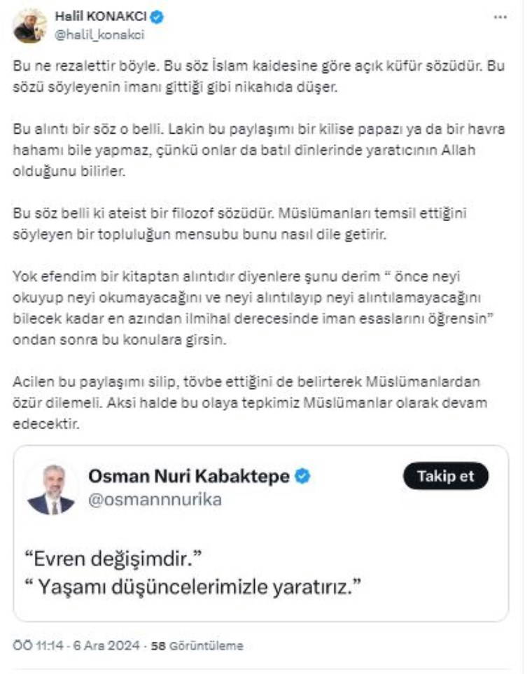 Konakcı, X'teki hesabından Kabaktepe'nin ilgili paylaşımını alıntılayıp "Bu ne rezalettir böyle. Bu söz İslam kaidesine göre açık küfür sözüdür. Bu sözü söyleyenin imanı gittiği gibi nikahıda düşer. Bu paylaşımı bir kilise papazı ya da bir havra hahamı bile yapmaz, çünkü onlar da batıl dinlerinde yaratıcının Allah olduğunu bilirlerBu söz belli ki ateist bir filozof sözüdür. Müslümanları temsil ettiğini söyleyen bir topluluğun mensubu bunu nasıl dile getirir" diye tepki gösterdi.