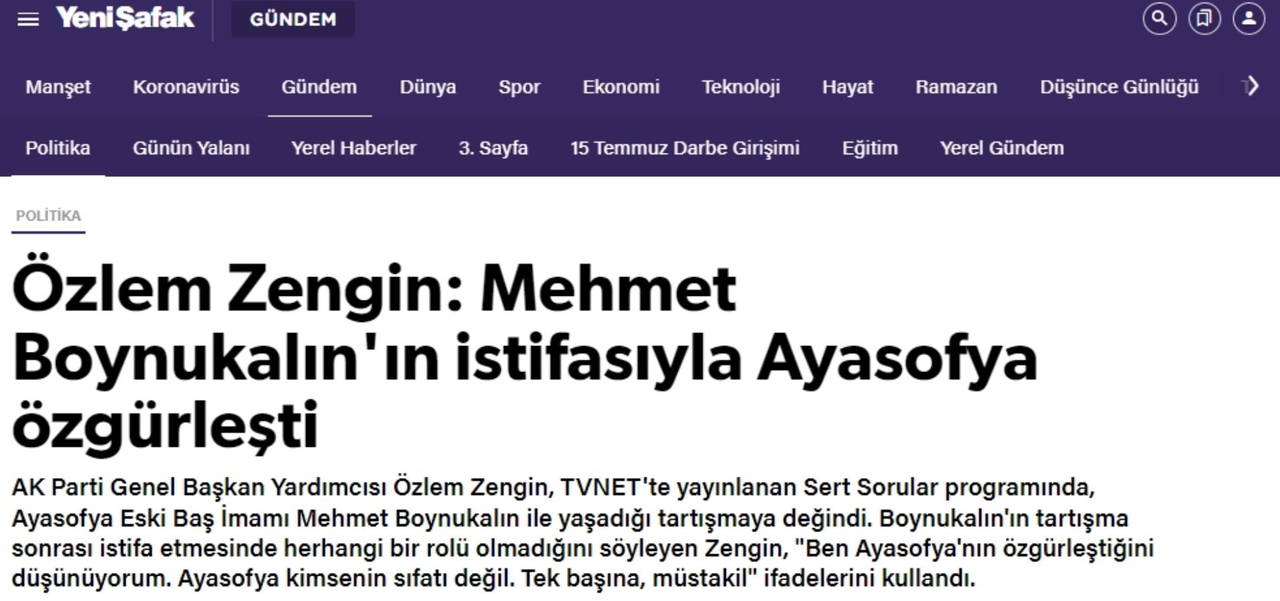 Zengin’in bu sözleri Yeni Şafak gazetesinde “Özlem Zengin: Mehmet Boynukalın'ın istifasıyla Ayasofya özgürleşti” başlığıyla haberleştirildi.