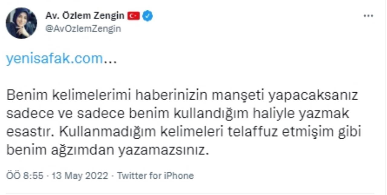 AKP Genel Başkan Yardımcısı Özlem Zengin, AKP'ye yakın Yeni Şafak'a kendisiyle ilgili yayımladığı haber üzerine tepki gösterdi.