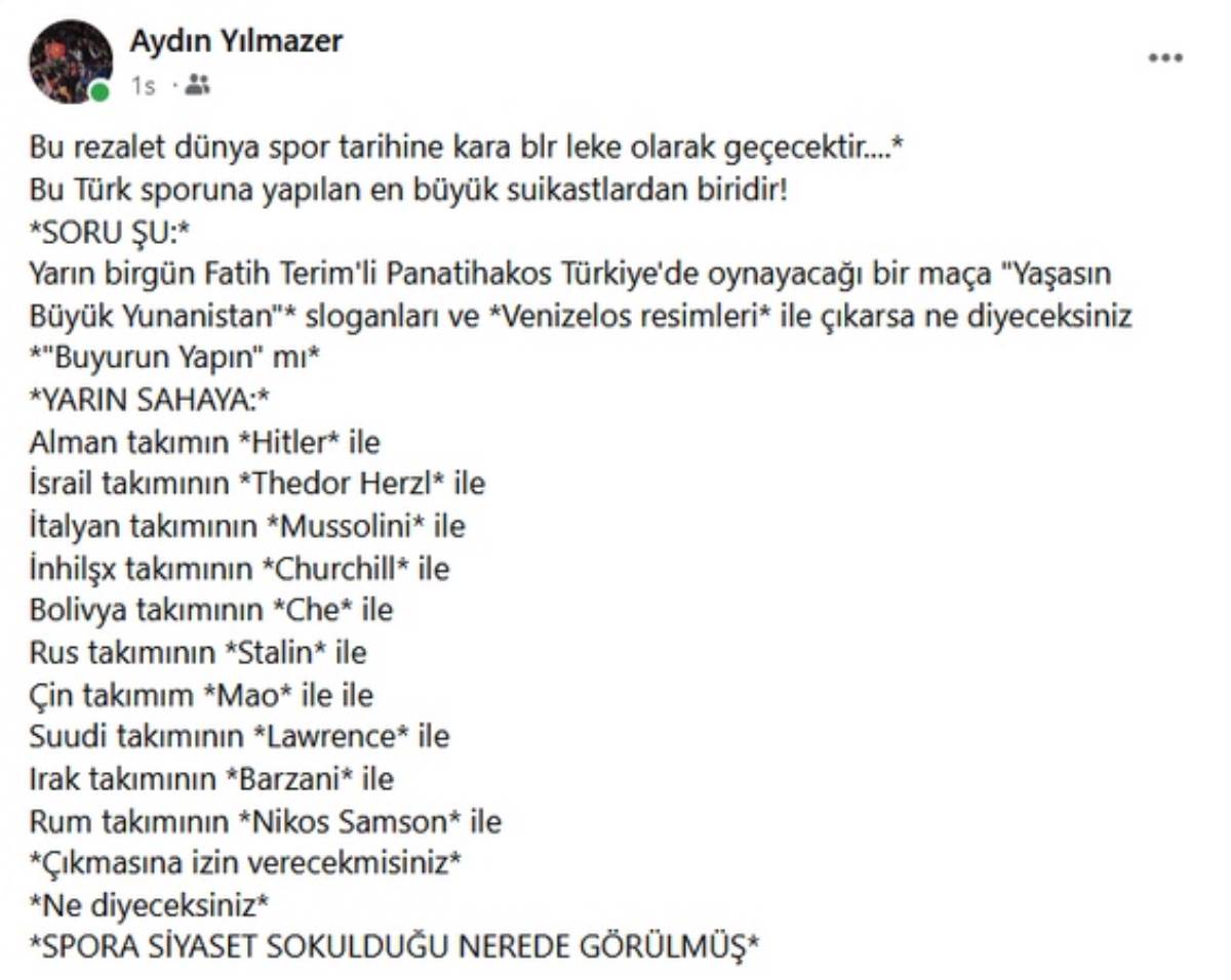 "Soru şu: Yarın bir gün Fatih Terim'li Panathinaikos Türkiye'de oynayacağı bir maça 'Yaşasın Büyük Yunanistan' sloganları ve *Venizelos resimleri ile çıkarsa ne diyeceksiniz? 'Buyurun Yapın' mı? Alman takımın Hitler ile, İsrail takımının Thedor Herzl ile, İtalyan takımının Mussolini ile, İngiliz takımının Churchill ile, Bolivya takımının Che ile, Rus takımının Stalin ile, Çin takımım Mao ile, Suudi takımının Lawrence ile, Irak takımının Barzani ile, Rum takımının Nikos Sampson ile çıkmasına izin verecekmisiniz? Spora siyaset sokulduğu nerede görülmüş?"