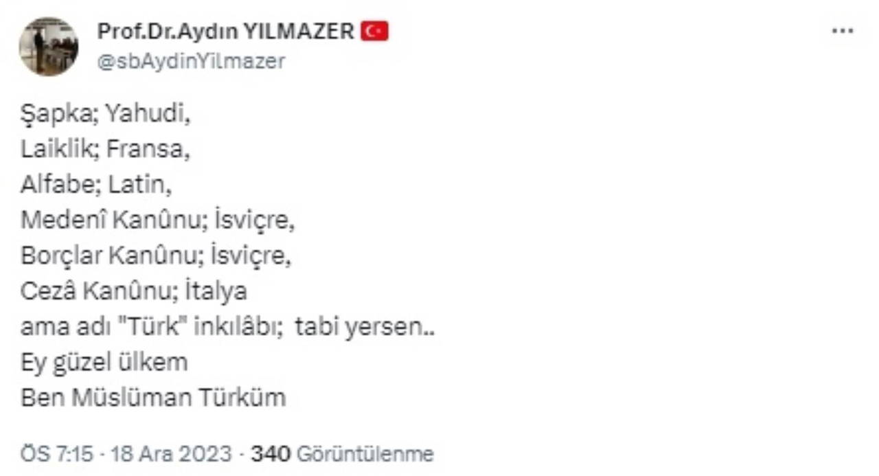 Prof. Dr. Aydın Yılmazer daha öncesinde de X sosyal medya hesabında Cumhuriyet devrimlerinden rahatsızlığını açıkça dile getirmiş. Öyle ki Prof. Dr. Yılmazer, devrim kanunlarını ve kanunların alındığı ülkeleri sıraladığı paylaşımında "Ama adı 'Türk' inkılâbı; tabi yersen.. Ey güzel ülkem ben Müslüman Türküm" ifadelerini kullanmış.