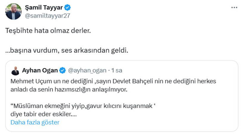 AKP'li Şamil Tayyar ardından yeni bir paylaşım daha yaparak isim vermeden hedef aldı. Tayyar paylaşımında şu ifadelere yer verdi: