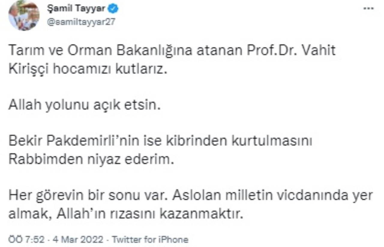 Şamil Tayyar'ın Twitter hesabı üzerinden yazdığı mesajında, Bekir Pakdemirli'nin yerine Bakanlık görevine getirilen Prof. Dr. Vahit Kirişçi'yi kutlarken Pakdemirli için ise "kibrinden kurtulmasını Rabbimden niyaz ederim" dedi.