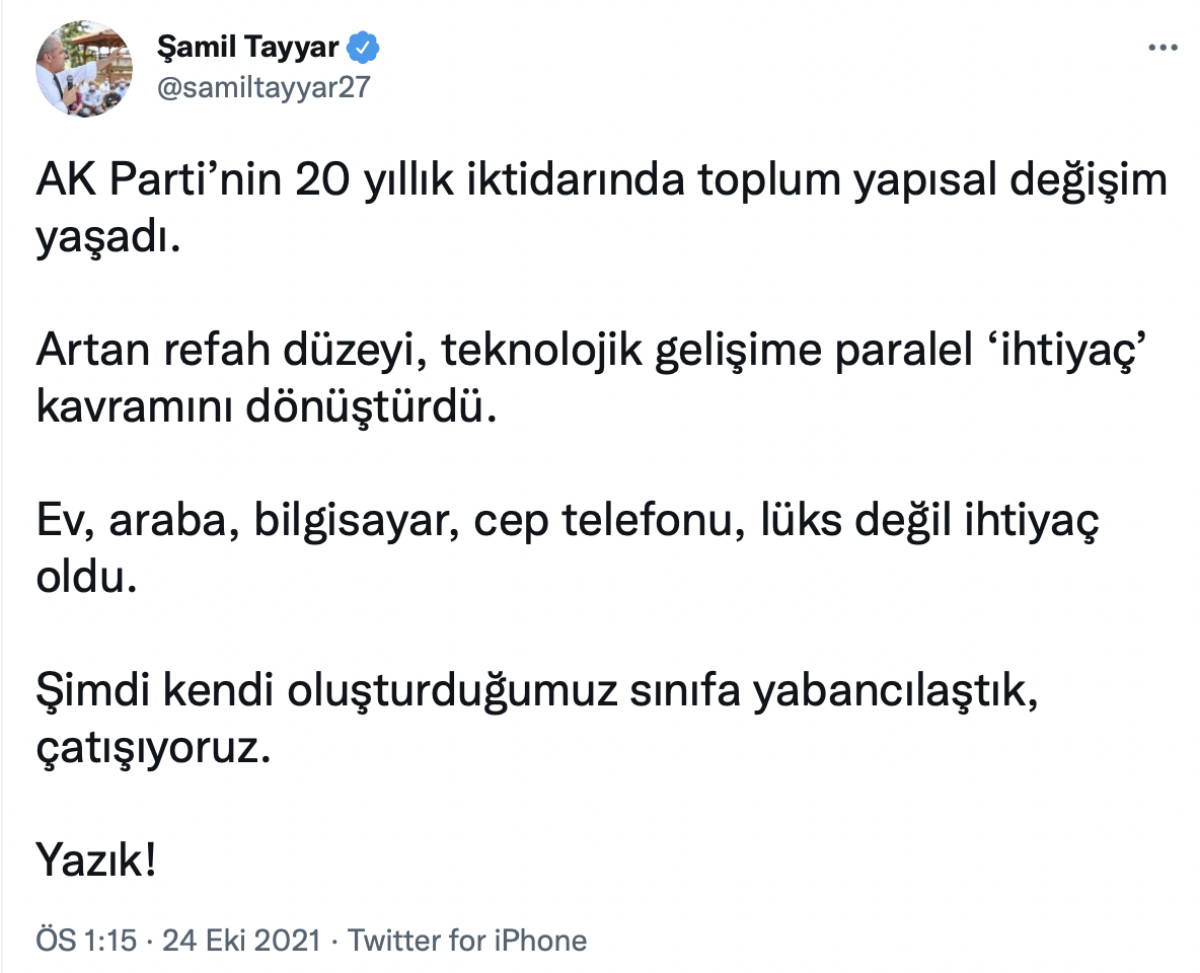 Twitter hesabından paylaşım yapan AKP Merkez Karar ve Yönetim Kurulu (MKYK) Üyesi Şamil Tayyar son dönemde AKP’li isimler tarafından ekonomik kriz üzerine isyan eden yurttaşlara “Telefonunuz, arabanız var” sözlerini eleştirdi.