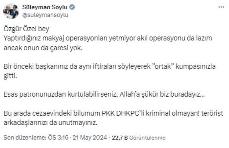 AKP'li Süleyman Soylu, bunun üzerine Özel'e bir "yanıt" verdi. Sosyal medya hesabı üzerinden CHP Genel Başkanı Özel'e seslenen Süleyman Soylu, çirkin ifadeler kullanmaktan geri durmayarak "Yaptırdığınız makyaj operasyonları yetmiyor akıl operasyonu da lazım ancak onun da çaresi yok" dedi.