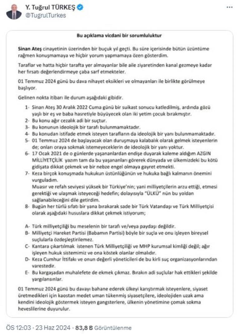 "Sinan Ateş 30 Aralık 2022 Cuma günü bir suikast sonucu katledilmiş, ardında göz yaşlı bir eş ve baba hasretiyle büyüyecek iki yetim çocuk bırakmıştır" diyen Türkeş, konunun "ağır cezalık adi bir suç olduğunu ve ideolojik bir tarafı bulunmadığını" öne sürdü.