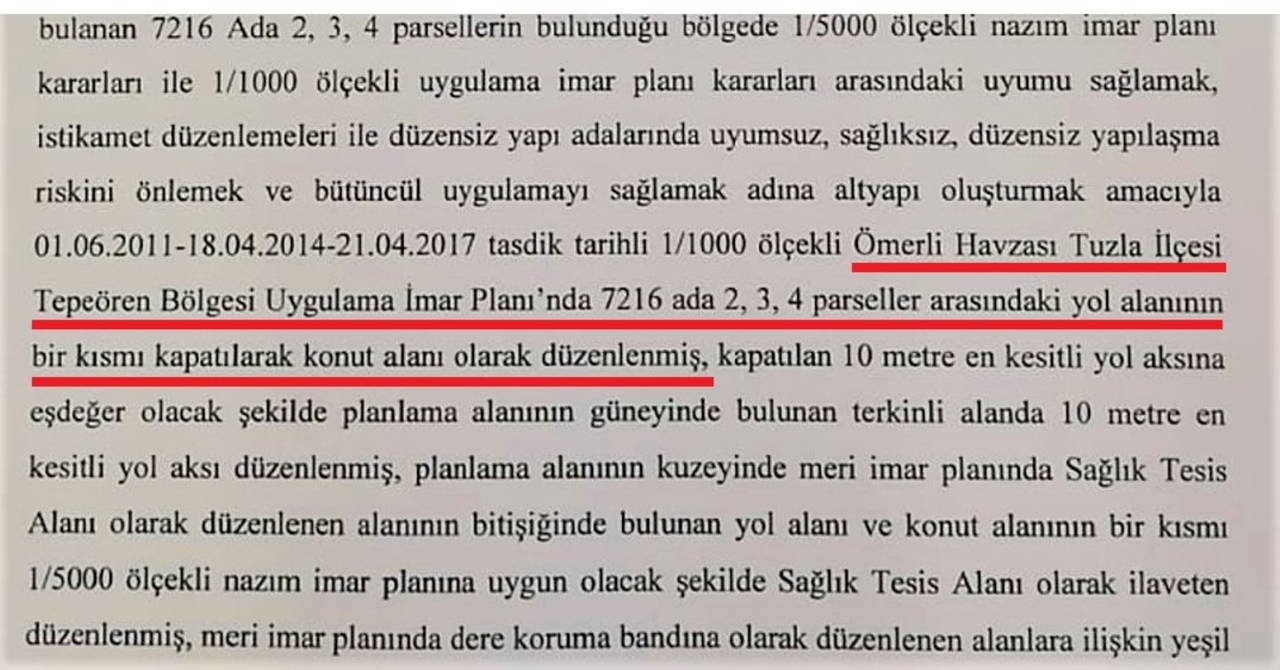 Bir kısım terkinli alan ve istikamet düzenlemesi şeklinde hazırlanan plan değişikliği ile parselleri birbirinden ayıran yolların bir kısmının iptal edilmesini kapsıyordu. Tuzla Belediyesi’nin 2011 yılında yaptığı imar planlarında söz konusu parseller bir birinden 10 metre genişliğindeki yollarla ayrılmıştı.