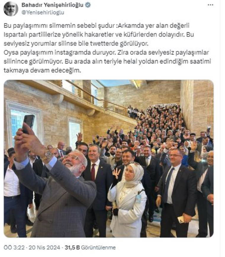 "Bu paylaşımımı silmemin sebebi şudur: Arkamda yer alan değerli Ispartalı partililerimize yönelik hakaretler ve küfürlerden dolayıdır. Bu seviyesiz yorumlar silinse bile twitterde görülüyor. Oysa paylaşımım instagramda duruyor. Zira orada seviyesiz paylaşımlar silinince görülmüyor" AKP'li vekil, "Bu arada alın teriyle helal yoldan edindiğim saatimi takmaya devam edeceğim" ifadelerini kullandı.