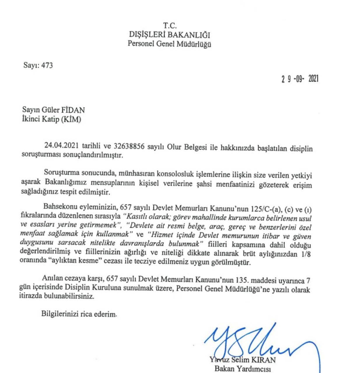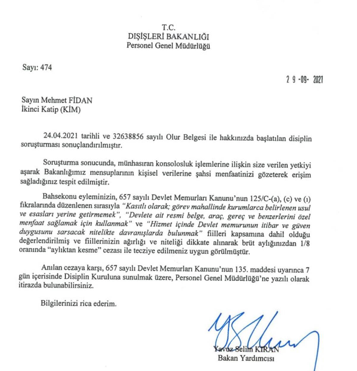 Cumhuriyet'in edindiği bilgilere göre, bakanlığın soruşturması sonucunda Fidan çiftine ceza verildi. Bakanlığın kararında, "Fiillerinizin ağırlığı ve niteliği dikkate alınarak brüt aylığınızdan 1/8 oranında 'aylıktan kesme' cezası ile tecziye edilmeniz uygun görülmüştür" denildi.