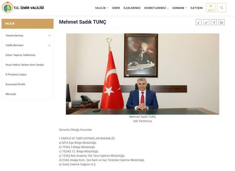 İzmir Valiliği'nin resmi sitesinde Tunç'un adı hâlen duruyor