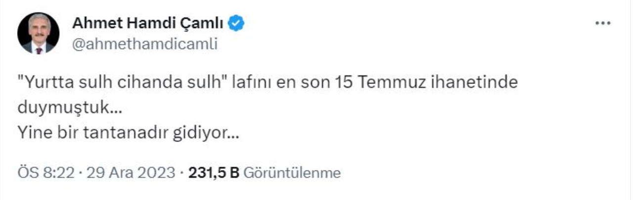 Yaşanan kriz sonrası AKP'li Ahmet Hamdi Çamlı, X üzerinden Cumhuriyet'in kurucusu ulu Önder Mustafa Kemal Atatürk'ün sözünü "15 Temmuz" ile ilişkilendirdi.