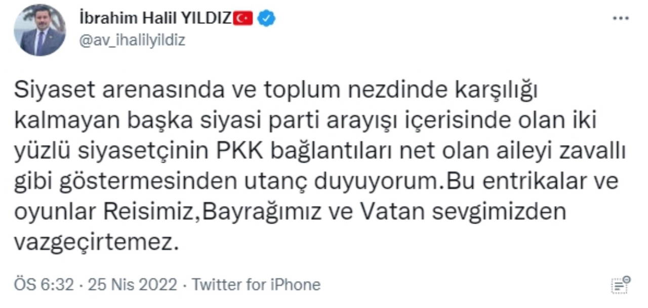 Sosyal medya üzerinden yaptığı paylaşımda, Ahmet Eşref Fakıbaba’ya isim vermeden göndermelerde bulunan Yıldız, “Siyaset arenasında ve toplum nezdinde karşılığı kalmayan başka siyasi parti arayışı içerisinde olan iki yüzlü siyasetçinin PKK bağlantıları net olan aileyi zavallı gibi göstermesinden utanç duyuyorum" dedi.
