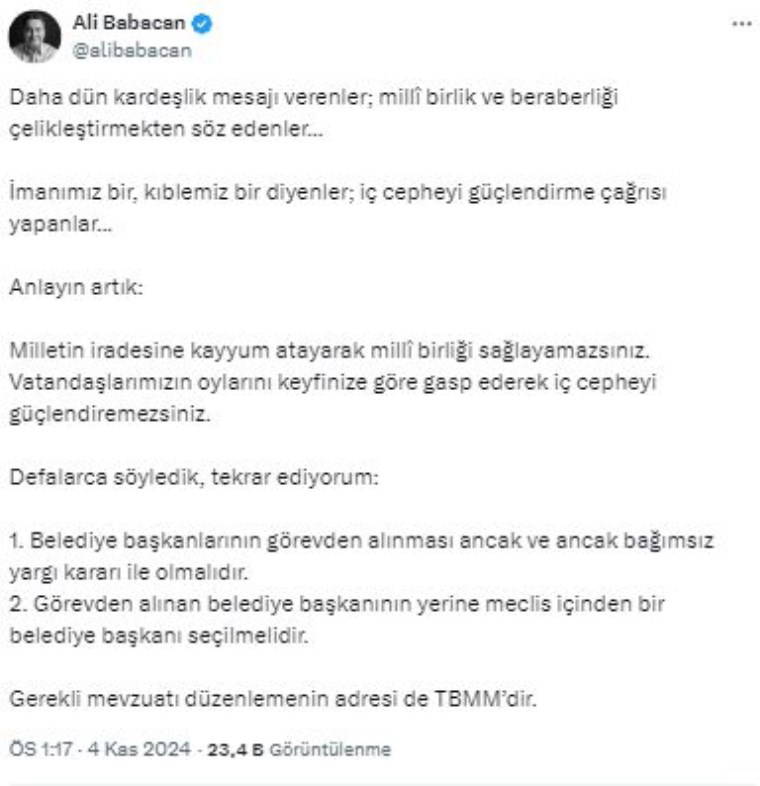 "Daha dün kardeşlik mesajı verenler; milli birlik ve beraberliği çelikleştirmekten söz edenler... İmanımız bir, kıblemiz bir diyenler; iç cepheyi güçlendirme çağrısı yapanlar... Anlayın artık: Milletin iradesine kayyum atayarak milli birliği sağlayamazsınız. Vatandaşlarımızın oylarını keyfinize göre gasp ederek iç cepheyi güçlendiremezsiniz. Defalarca söyledik, tekrar ediyorum: 1. Belediye başkanlarının görevden alınması ancak ve ancak bağımsız yargı kararı ile olmalıdır. 2. Görevden alınan belediye başkanının yerine meclis içinden bir belediye başkanı seçilmelidir. Gerekli mevzuatı düzenlemenin adresi de TBMM’dir."