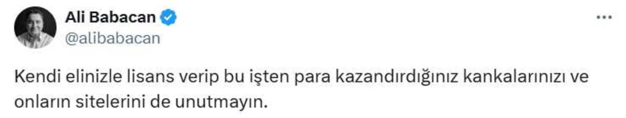 Erdoğan'ın bu sözlerine DEVA Partisi Genel Başkanı Ali Babacan, "Kendi elinizle lisans verip bu işten para kazandırdığınız kankalarınızı ve onların sitelerini de unutmayın" sözleriyle tepki gösterdi.