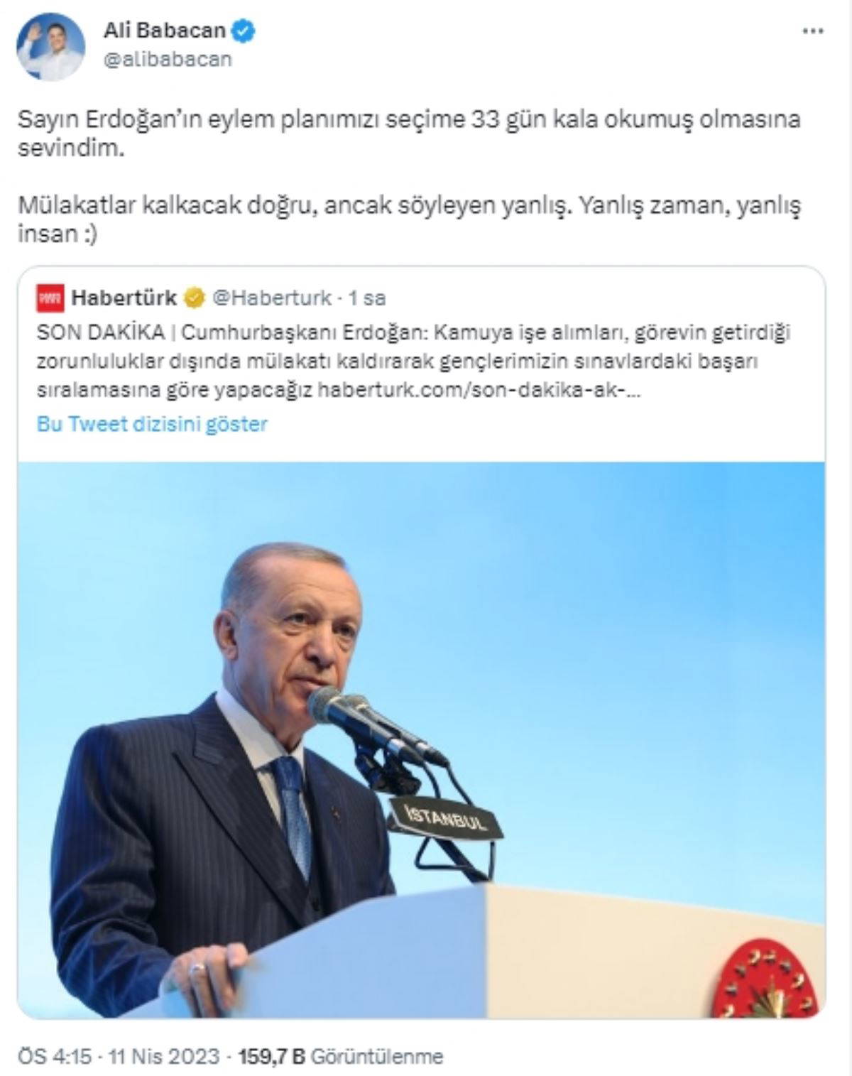 Erdoğan'ın seçim beyannamesininn ilgili bölümünün yer aldığı haberi içeren tweet'i alıntılayan Babacan, "Sayın Erdoğan’ın eylem planımızı seçime 33 gün kala okumuş olmasına sevindim. Mülakatlar kalkacak doğru, ancak söyleyen yanlış. Yanlış zaman, yanlış insan" dedi.