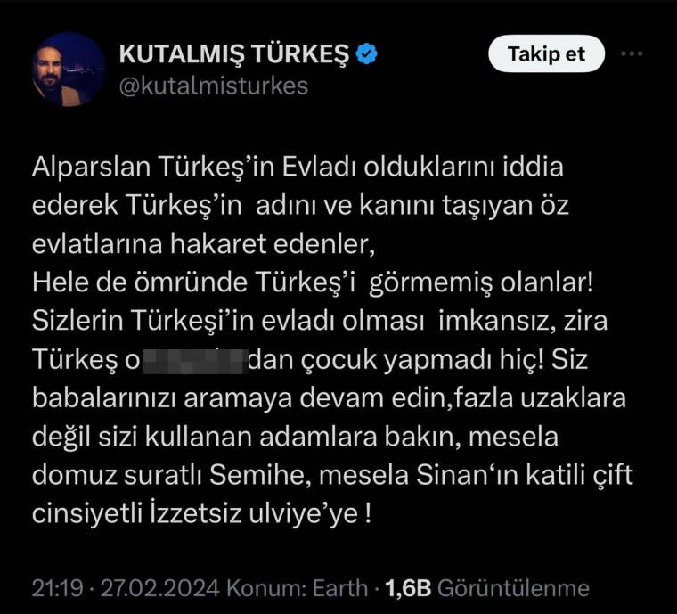 "Sizlerin Türkeşi’in evladı olması imkansız, zira Türkeş o***lardan çocuk yapmadı hiç! Siz babalarınızı aramaya devam edin, fazla uzaklara değil sizi kullanan adamlara bakın, mesela domuz suratlı Semihe, mesela Sinan‘ın katili çift cinsiyetli İzzetsiz ulviye’ye!"