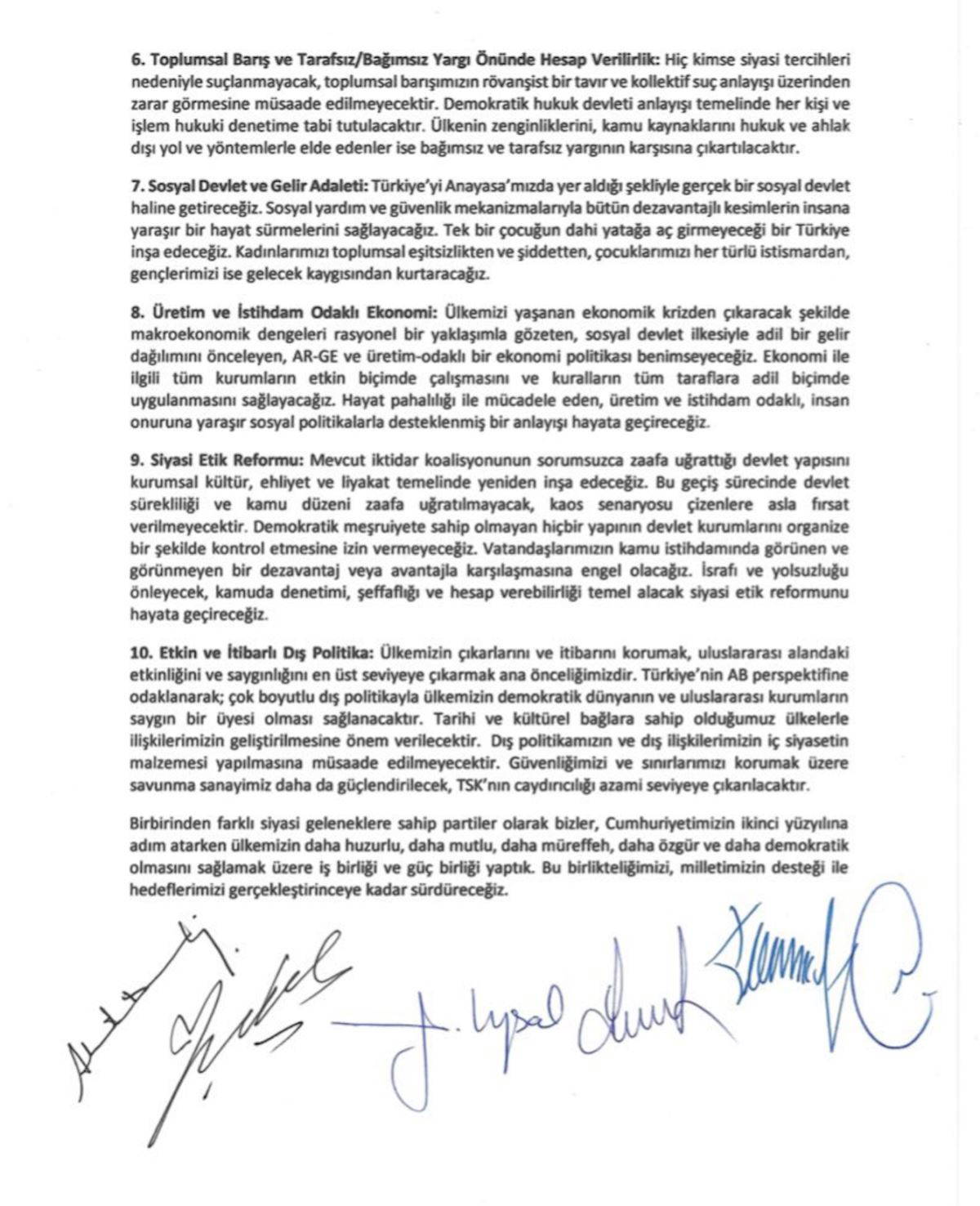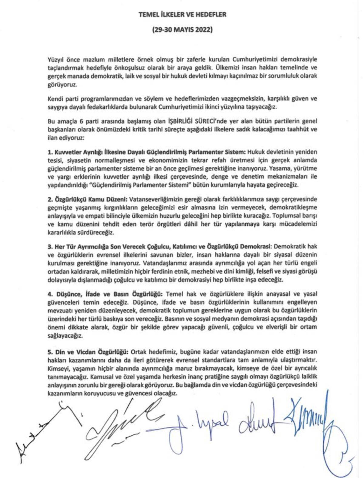 Bu amaçla 6 parti arasında başlamış olan iş birliği sürecinde yer alan bütün partilerin genel başkanları olarak, önümüzdeki kritik tarihi süreçte aşağıdaki ilkelere sadık kalacağımızı taahhüt ve ilan ediyoruz: