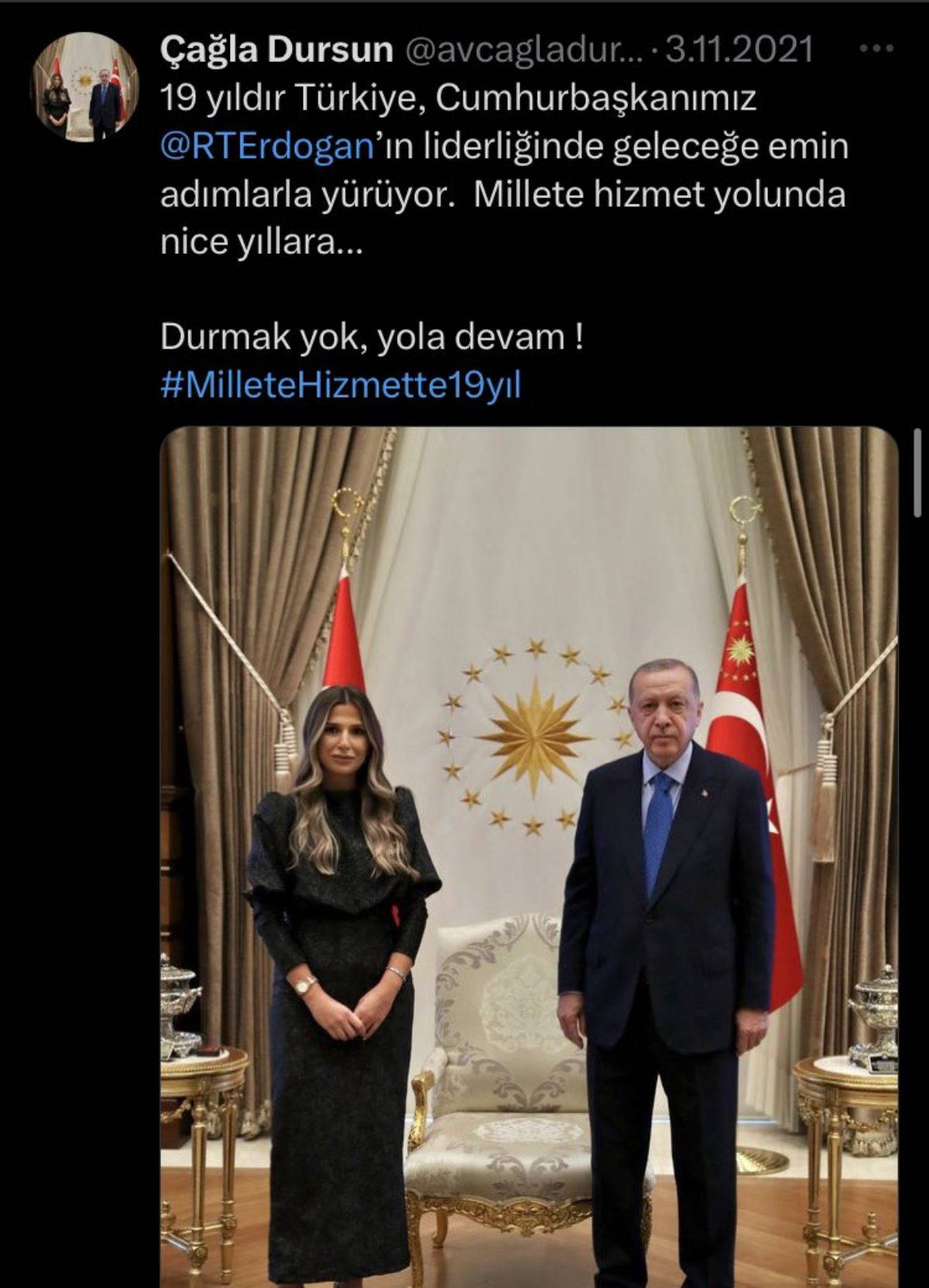 Sanık avukatlarından Çağla Dursun’un iktidarla yakınlığı dikkat çekiyor. Dursun, sosyal medya hesabından Cumhurbaşkanı Recep Tayyip Erdoğan ile olan bir fotoğrafını paylaşarak, “Türkiye, cumhurbaşkanımız liderliğinde geleceğe emin adımlarla yürüyor” ifadelerini kullandı.