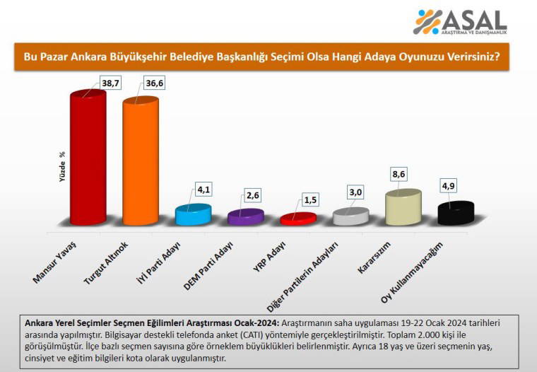 Bu kapsamda kamuoyu araştırmaları da hız kazandı. Asal Araştırma şirketi 31 Mart yerel seçimleri için katılımcılara "Bu pazar Ankara Büyükşehir Belediye Başkanlığı seçimi olsa hangi siyasi partiye oyunuzu verirsiniz?" sorusunu yöneltti.