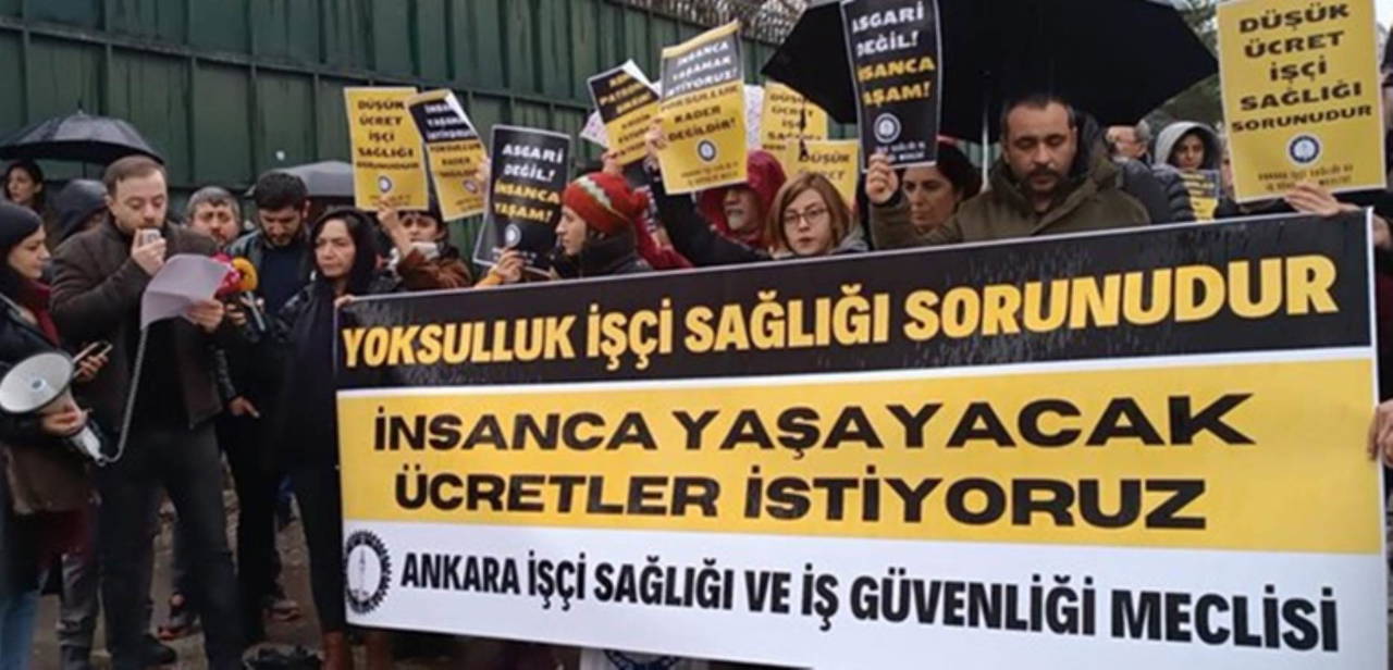 Ankara İşçi Sağlığı ve İş Güvenliği Meclisi'nden Kansu Yıldırım, "Patronların 10’a 5 çoğunlukta olduğu, işçi kesimi adına sadece en çok üyeye sahip konfederasyonun masaya oturduğu, çoğunlukla hükümet tarafından alınan bir siyasi kararın usulen görüşüldüğü Asgari Ücret Tespit Komisyonu, işçileri ve emekçi halkımızı temsil etmemektedir. Asgari ücret görüşmeleri en büyük toplu pazarlık süreci haline dönüşürken işçi sınıfının bütün hak arama yolları tıkalıdır” dedi. Belediye işçisi Kamil Sağlam ise, "Bizler açlıkla sınanırken, yoksulluğa razı durumuna geldik. Yoksulluğa razıyız ama sabrımızı sınamayın. Yoksulluk sınırının altında çalışmayı reddediyoruz" diye konuştu.