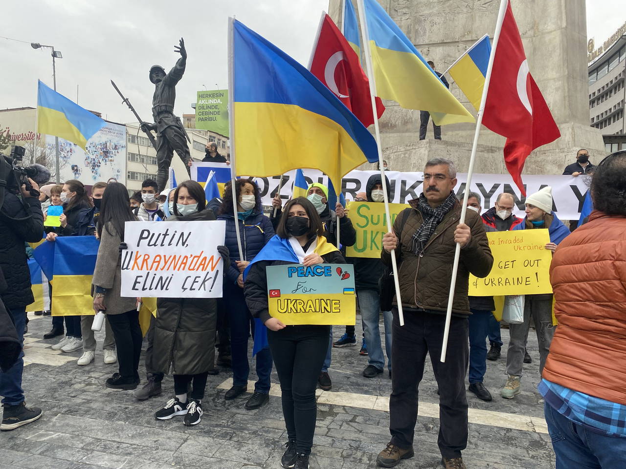 Ukrayna Derneği Ankara Başkanı Yuliia Biletska ise Ukrayna’nın saldırı altında olduğunu kaydedip, "Bağımsız bir ülkeyi yok sayan, onun halkına değer vermeyen açgözlü Putin, Türkiye dahil bütün bölge ülkeleri ve hatta tüm dünya için bir tehdittir. Bu, askeri müdahale ya da özel operasyon değildir. Bu açık bir şekilde uluslararası hukukun ihlalidir. Egemen, bağımsız ve demokratik bir ülkeye açılmış bir savaştır. Bir işgaldir. Bu süreç ve öncesinde, Ukrayna’ya verdikleri destekten dolayı dost Türk halkına ve Türkiye’ye çok teşekkür ediyoruz" diye konuştu. Kalabalık, açıklamaların ardından dağıldı.